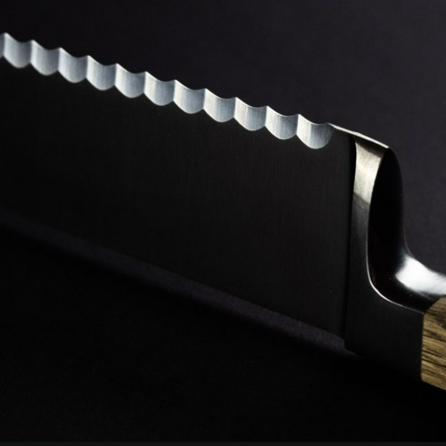 Gude SYNCHROS Series Forged Serrated Bread Knife 12-in, Smoked Oakwood Handle